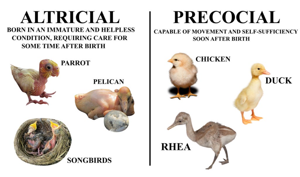 We need dads because human babies are hard to raise. We are born helpless. If you think of pregnancy as an oven, some species of babies come out well-toasted and others emerge underdone, in need of a little more baking time. Biologists call the former group “precocial” and the latter group “altricial.” A precocial animal is born ready to roll; think of an animal that can take its first steps within minutes of birth (like the foal) or find its own way to the ocean and swim (like a sea turtle). Megapodes, a “superprecocial” species of land-dwelling birds that includes the brush turkey, never even meet their parents. They claw their own way out of their eggs, fully feathered, with open eyes, able to forage for food and fly within a day or two of birth. In contrast, altricial animals, like mice and songbirds, are born naked and vulnerable.